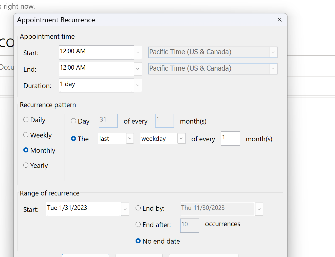 But, Yes, if "last calendar day of the month" (even if it falls on a weekend or holiday) is close enough for scheduling purposes, set "How often …" to Monthly on the [last] day. Scroll down the list of days to the very bottom where you'll find "last".