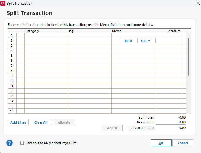 Upvoted this one. Especially the ability to re-size the Split Transaction window. Maybe even change the default size when it opens, remembering what you set it to last time? So we can actually see all the text for long memos and long category names.