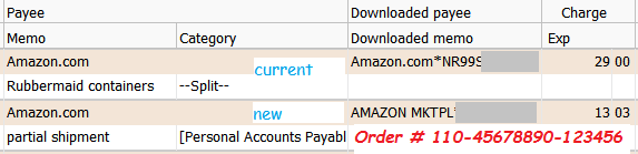 In that case, Amazon would have to be talked into downloading the real, clear text order number in the Downloaded Memo field instead of appending an encrypted order number to the Downloaded Payee Name field.