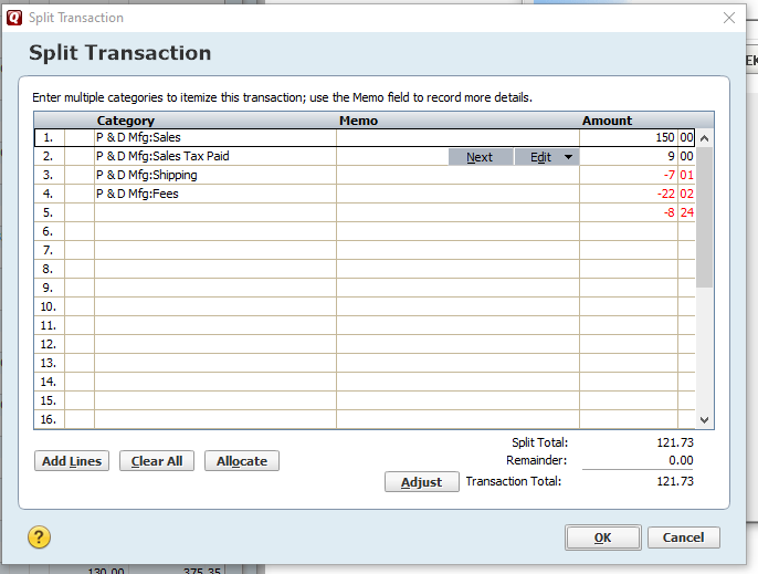 That's right, you want to make the split lines add up to the total you received, using negative numbers for the expenses.