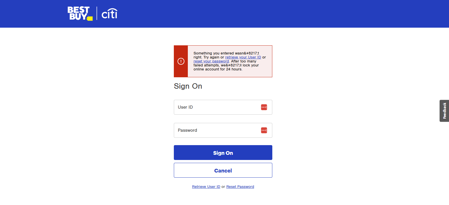 I am having this problem too. Using Quicken for Mac, but my login does not work on the Best Buy/Citibank login page that Quicken opens for me - but it does work on my Best Buy account when I log in.