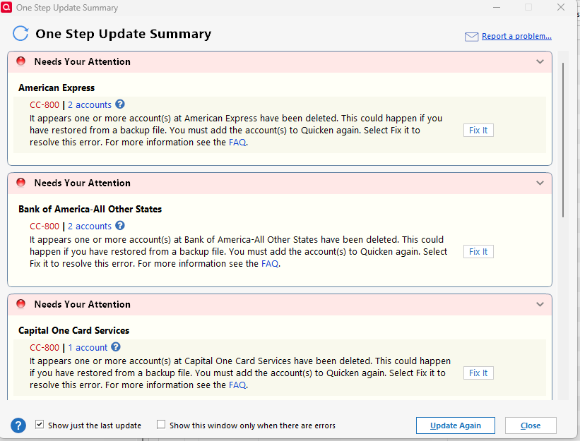 I can see that you're encountering the CP_ACCOUNT_NOT_FOUND error (WCC Code: CC-800) across multiple financial institutions, including American Express, Bank of America, Capital One, Citi Card, and Schwab. This error typically indicates that Quicken is unable to locate the corresponding accounts during the connection process.
