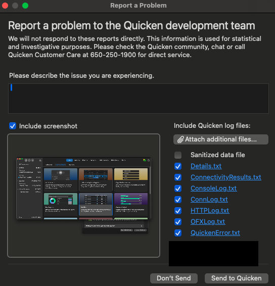 - Log Files: Navigate to Help > Report a Problem within Quicken and submit the log files. This will allow us to investigate the issue in more detail.