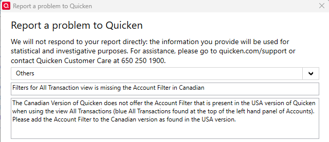 The Canadian Version of Quicken does not offer the Account Filter that is present in the USA version of Quicken when using the view All Transactions (blue All Transactions found at the top of the left hand panel of Accounts). Please add the Account Filter to the Canadian version as found in the USA version.