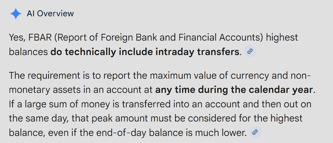 @BBG Can you cite an authoritative reference that says the FBAR report must include intraday balances rather than the closing balance for each day? Google AI says daily closing balances are sufficient, but neither Google nor I are tax advisors. You should consult your tax advisor. My prompt was