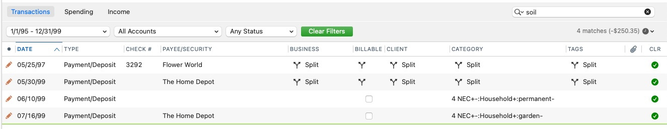 In accounts, I often use filtering, e.g., set a date range; maybe narrow down by account and/or status; and enter a search term. I also often want to clear the filters: dates, accounts, and status (often leftover from previous filtering)—but usually want to keep the search criteria (if not, I can clear it manually). I'd prefer that clicking: "Clear Filters" not clear the search criteria. I realize others may prefer to have the search criteria cleared along with dates/accounts/status, but if the majority would like the search box to not be cleared, the behavior ought to be changed. (And yes, the drop downs can be manually reset without clearing the search box, but that's not my point.)