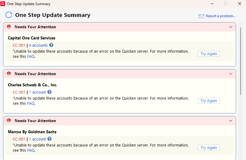 Why am I receiving download error code CC-501 for Capital One, Schwab & Marcus by Goldman Sachs All of a sudden? It started yesterday, Tuesday, 5/13/25 I believe. Screenshot attached.