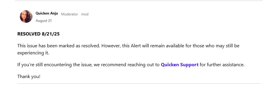 Using Quicken for Windows. Started encountering this problem early July 2025.