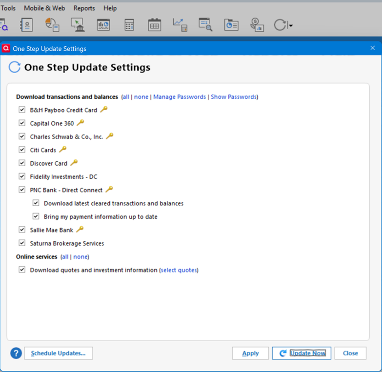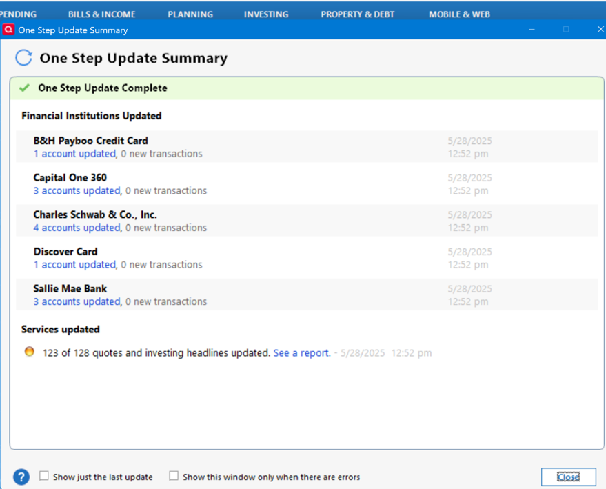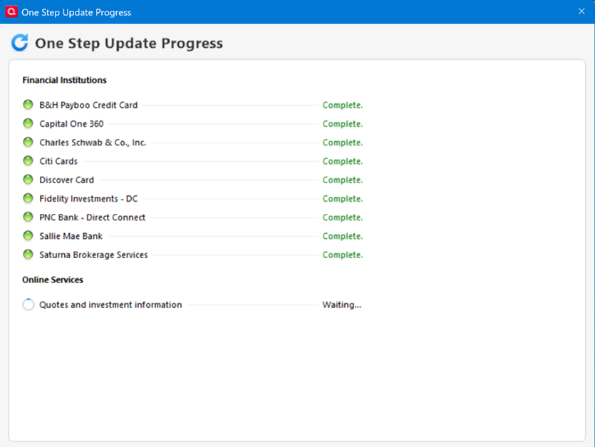 One Step Update Summary Not Reporting Direct Connect Updated Accounts. This started about 3 days ago, May 25. This would be Fidelity, Citi, PNC and Saturna Investments. All working fine before. I have changed nothing. My database was not restored. I use desktop only, no cloud, no mobile. The transactions are downloaded, Summary just does not show the Direct Connect accounts at all. No error messages.