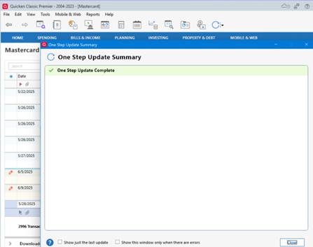 If you update from within a Direct Connect account, you also get the summary above. However in the case of Citi (Mastercard) below is the summary you get. It would seem to me that the different response from Citi, or any recent programming changes to the Citi interface, might be causing the issue with all the Direct Connect accounts.