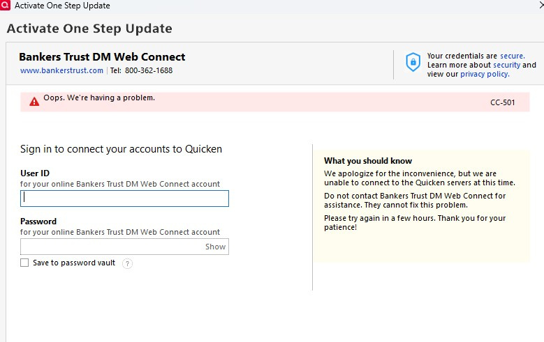For the past couple of weeks, I have been trying to add an account from Bankers Trust Web Connect. When doing so, I am getting a CC-501 error code. I have other accounts connected to this bank and have not had any issues with them updating, but cant add new accounts. (and yes, I am using the correct user ID and password)