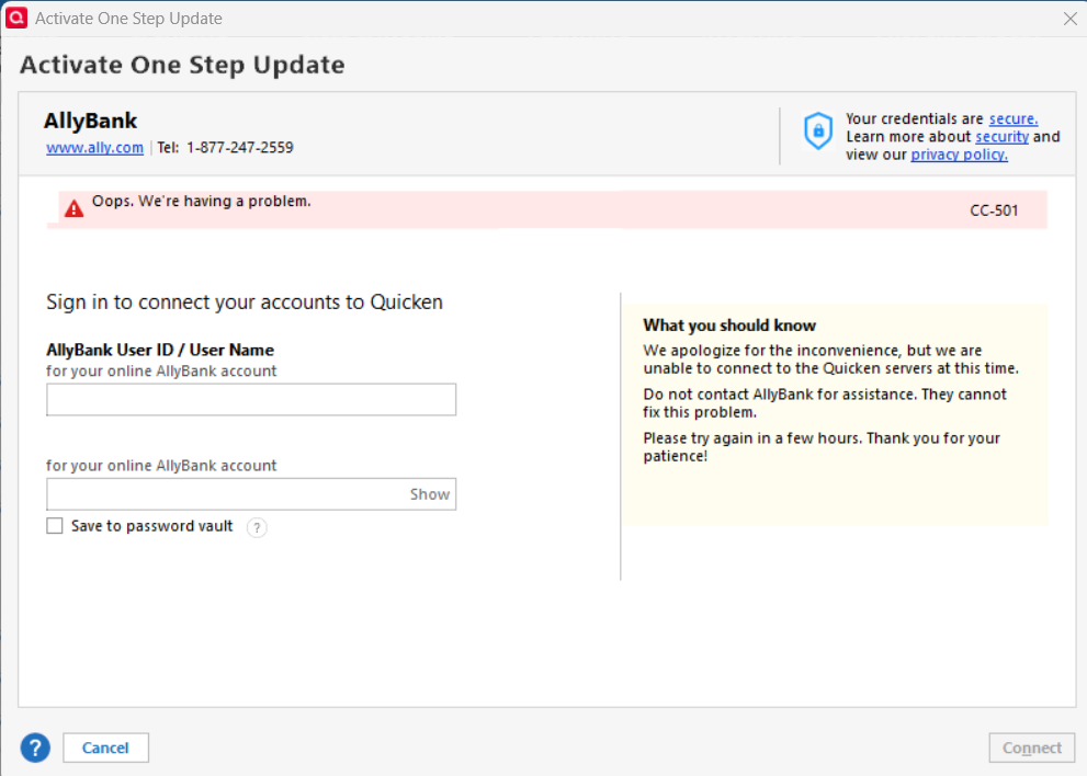 or I get a popup to add an account. I enter in my username and password for the financial institution and always get the following error: