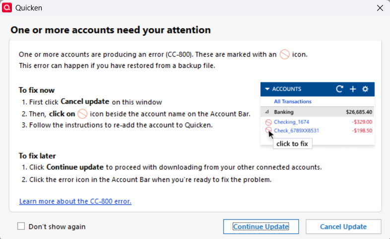 We know how disruptive CC-800 errors can be, and we truly appreciate your ongoing patience. While this issue is often linked to frequently restoring backups or switching between multiple Quicken files, we understand that’s not always the case. Please know that our team is working hard behind the scenes to improve how this error is handled and lessen its effect on your experience.