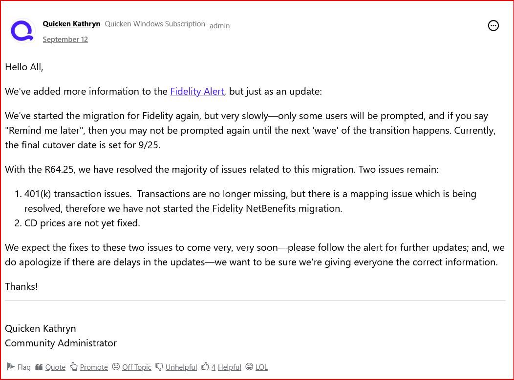 Personally, as a 28 year product manager I would never dribble this out at all in the condition it is in. And can you just imagine Quicken Fidelity user's that are unaware of these forums or chose not to come here?