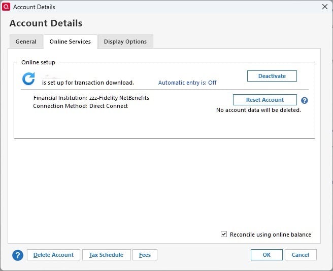 My 401K account details. Note, I have 2 401k's at Fidelity (2 different employers), both read the same. They are separate accounts in Quicken, same Fidelity login.