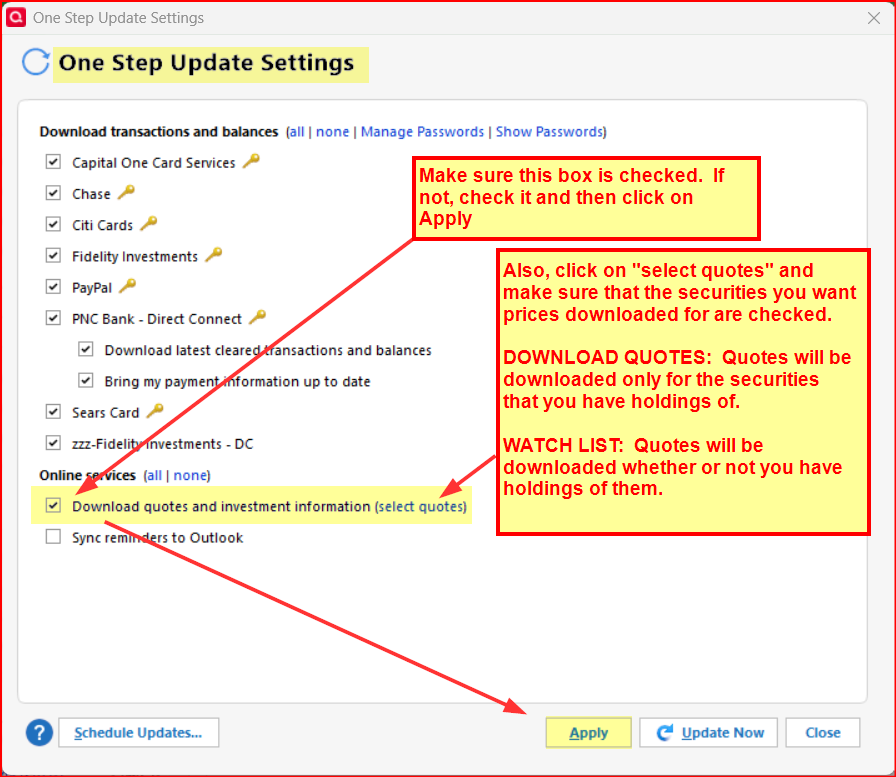 Since the troubleshooting above did not help to correct the issue, unless the problem accounts are 401(k) accounts, I recommend that you reach out to Quicken Support directly for further assistance, as they have access to tools that we can't access on the Community, and they are able to escalate the issue as needed. The Quicken Support phone number can be found through this link here. Phone support is available from 5:00 am PT to 5:00 pm PT, Monday through Friday.