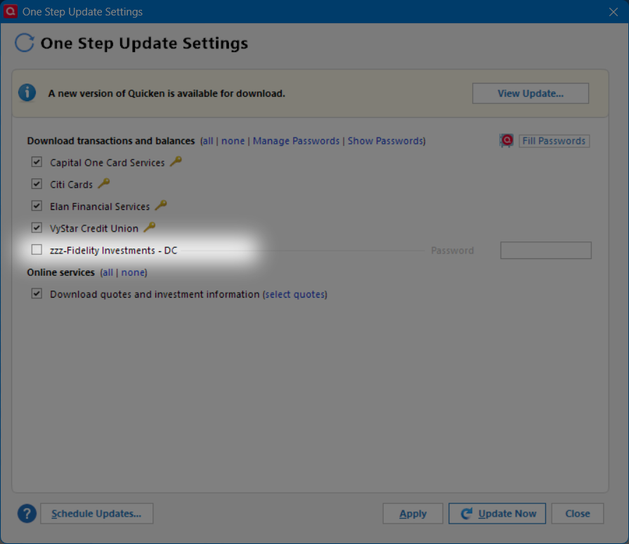 I just perform an update the account level when desired. There was no need to deactivate the Fidelity accounts to halt downloads. I did this in preparation to stop downloads for Fidelity depending on reports posted here on 8/20 if DC connection is still available.