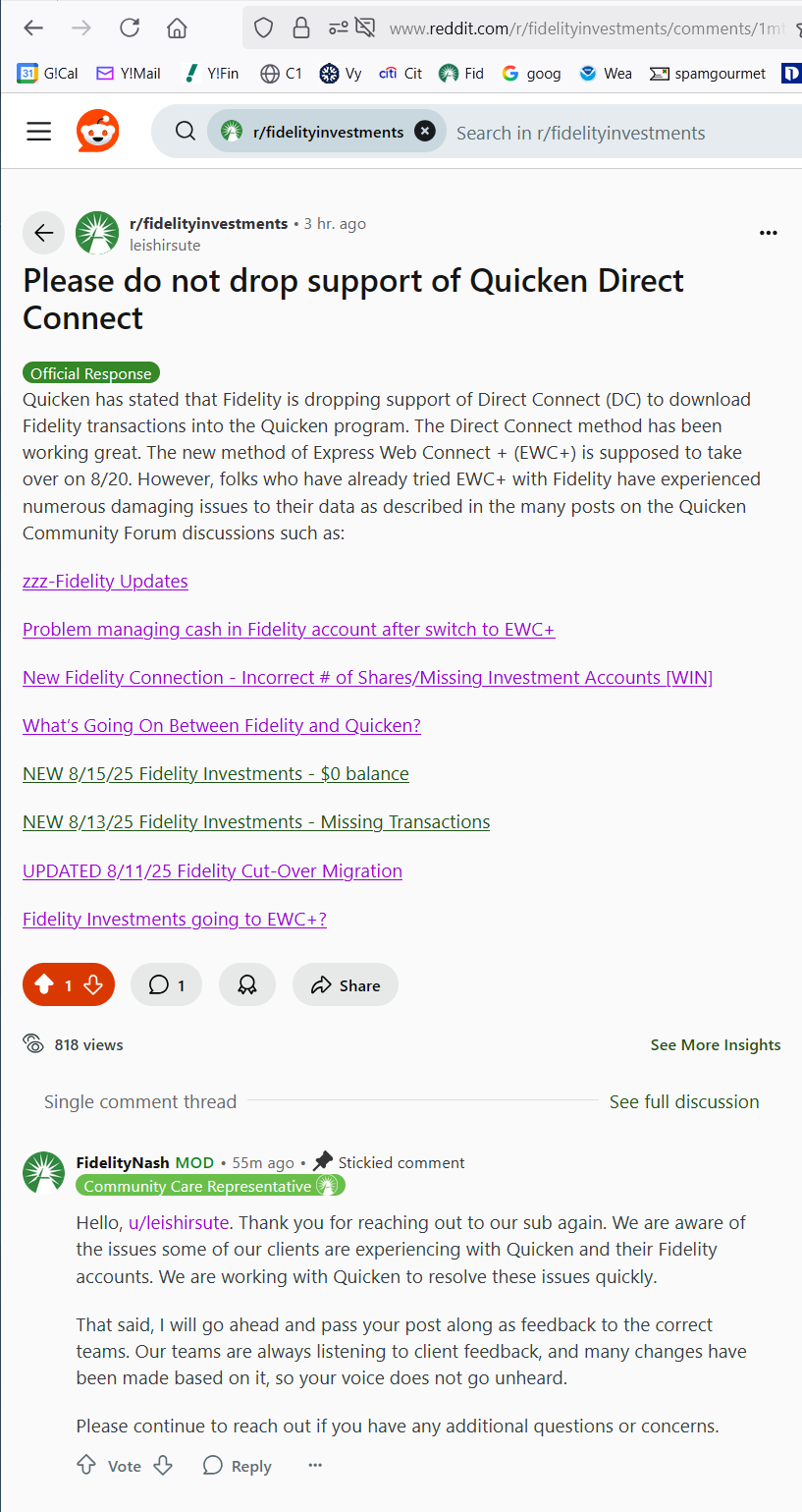 However, users like me who were previously cut over to the new system are basically out of luck, it's broken and will remain broken until Quicken and Fidelity can figure out the problem and fix it? [Edited - Language]