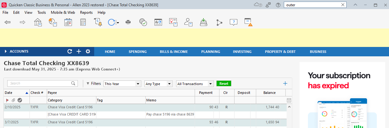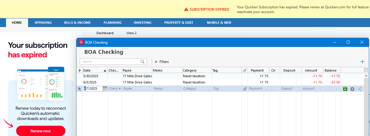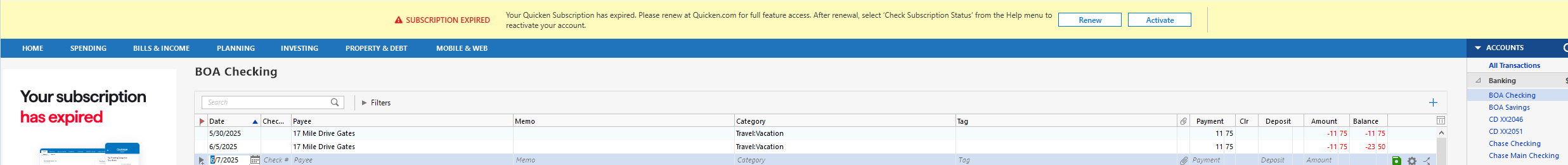 i chose not to renew as I do not need the download feature currently. i get the notice on right side of screen "YOUR SUBSCRIPTION HAS EXPIRED". It blocks the icon in upper right to give options to say transfer or add document such as bank statement. there is no way to remove the subscription has expired notice to access the icon.