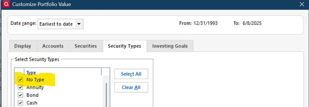 As I posted screen shot the -Cash- is shown for the Investment Brokerage Schwab account regardless of unselect the "No Security (includes Cash)". This De-select actually removes all other accounts from the report, those accounts were shown the -Cash- only, there are no Security with the "Emerging Fund" Goal for those extra accounts.