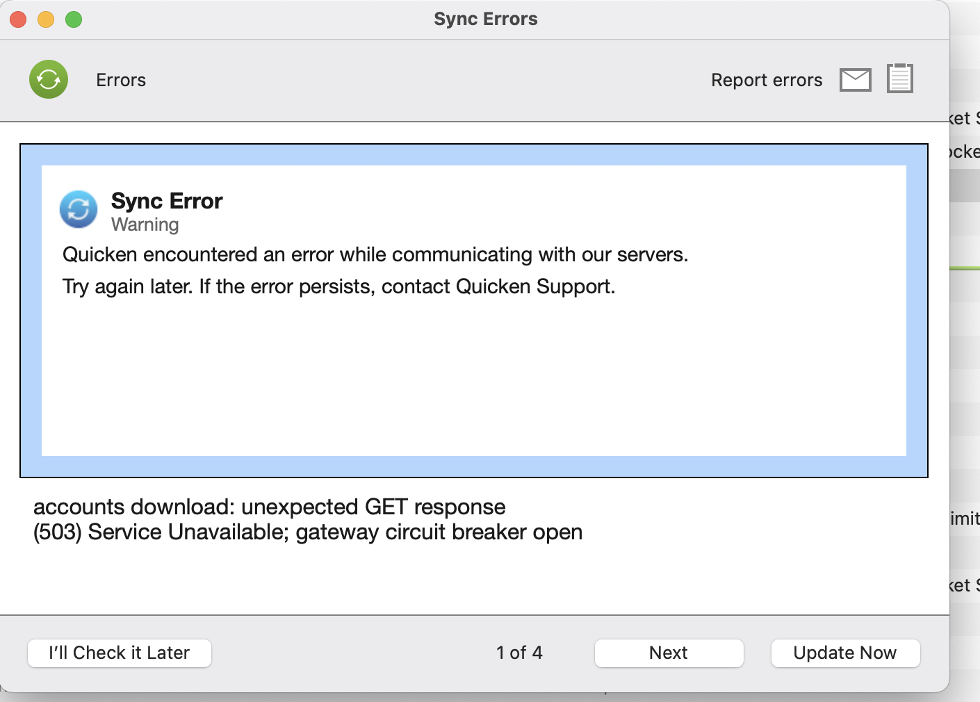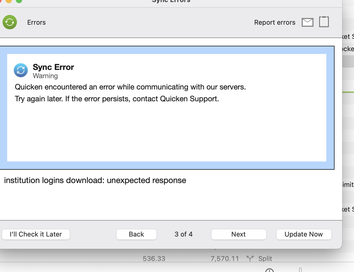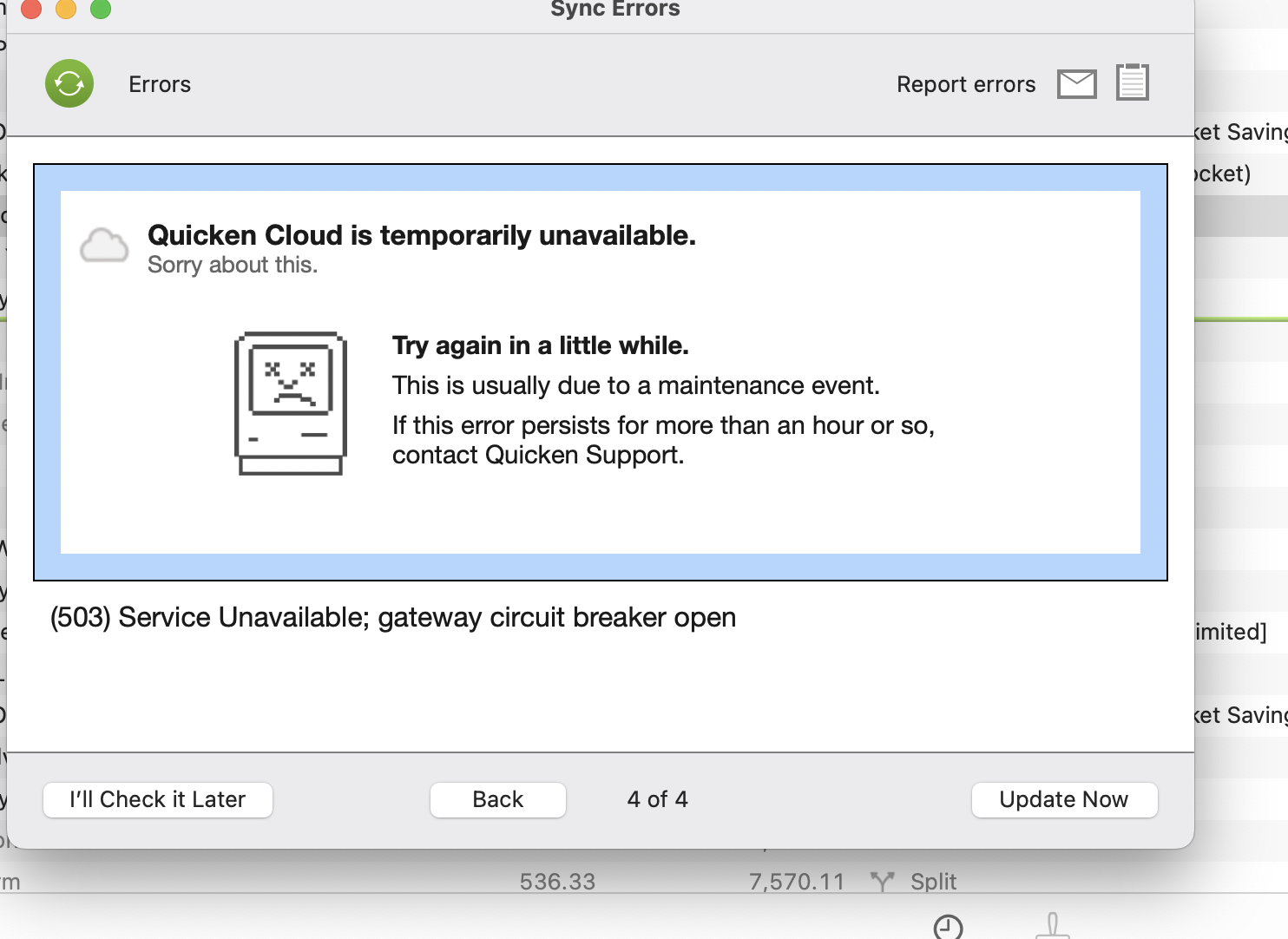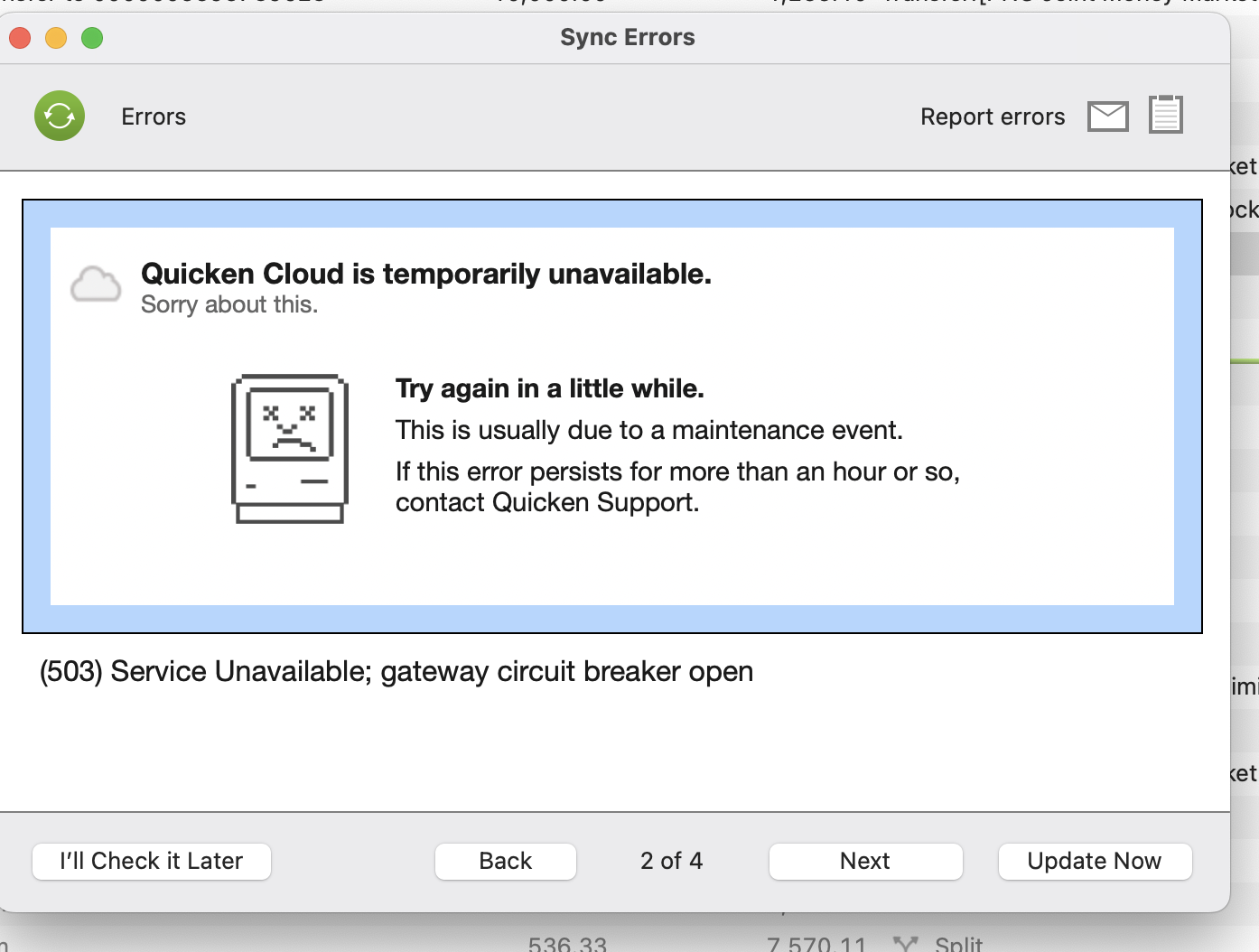 One Step Update: CC-501 "Unable to update these accounts because of an error on the Quicken server."