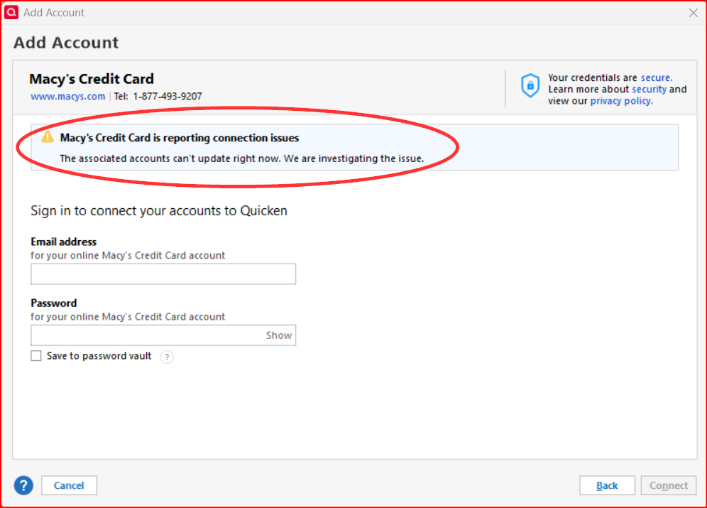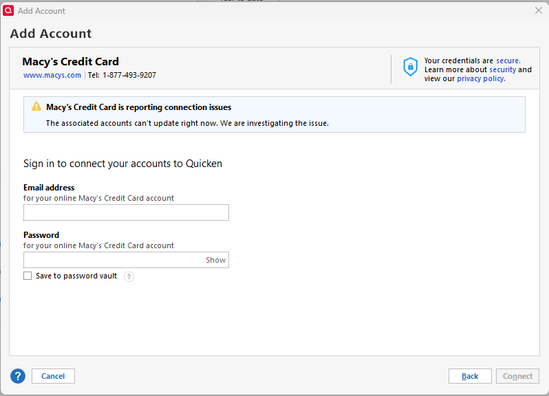 I've been having issues with Macy's credit card account that worked fine until the last week. I now get an error/warning that "Macy's Credit Card is reporting connection issues. The associated accounts can't update right now. We are investigating the issue." (see screenshot below). I tried Resetting and then Add the account but keep having the same issue.