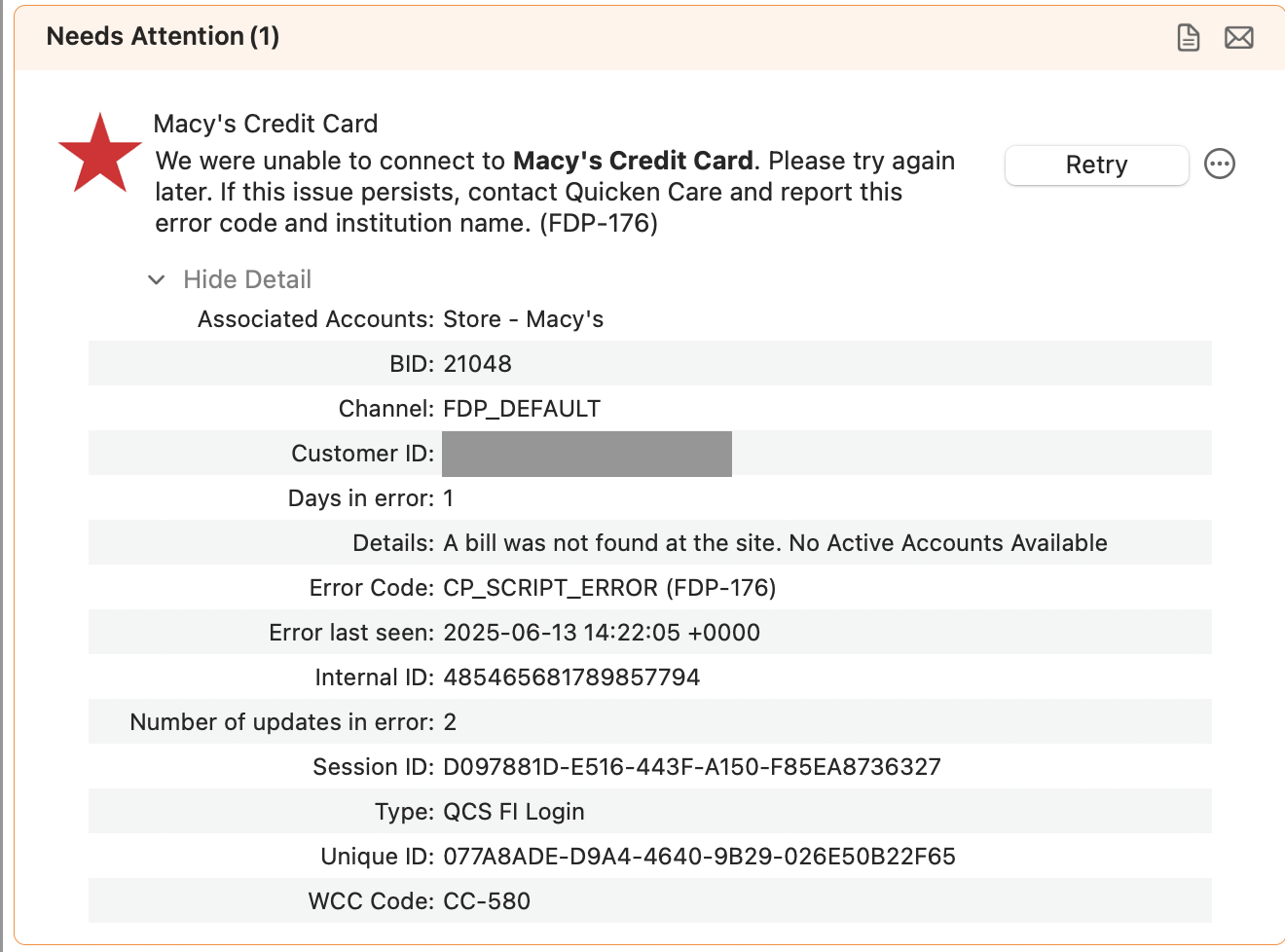 But today I noticed that when accessing my online Macy's Amex card in the Macy's website and clicking on some of the settings for that card I was pushed to a Citi Retail Services website. I don't recall seeing that before. It makes me wonder if this might be the cause behind the CC-502/CC-503 error's. In the past (earlier this year) when there has been similar migrations with other Citi Retail Services cards it seemed that successful Quicken setup for OSU was staggered with some users getting OSU service restored earlier than others.