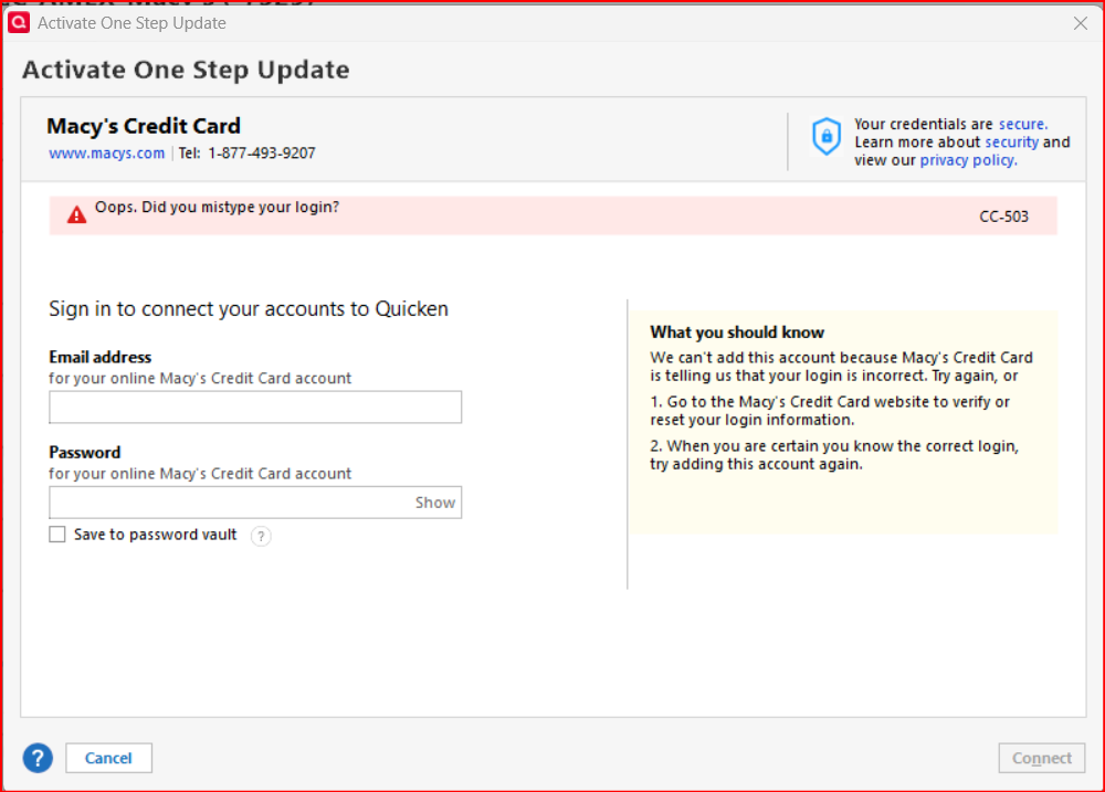 My guess…and it is simply a guess…is that Citi Retail Services and/or the Macy's credit card website are making changes to their interface with Quicken (actually to the interface with the aggregator) and that is what has caused this issue. 2-3 months ago Citi Retail Services went through a significant interface change (to support EWC—>EWC+) with other co-branded credit cards and it took 1-2 months to resolve most of the connection issues caused by that. I'm thinking this is just the next iteration of Citi's migration to EWC+.