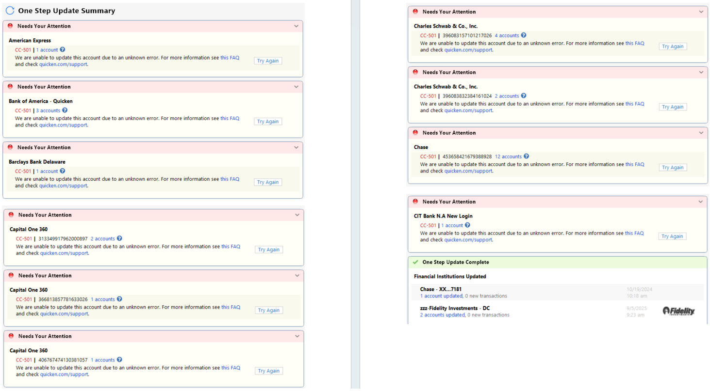 For the last 48 hours I have received CC-501s and have not been able to connect with the majority of my accounts at various institutions such as Chase, AMEX, Barclays, CapOne, Schwab, etc. (see attached screenshots). Interestingly, I am able to connect to SOME. Is anyone else seeing this?