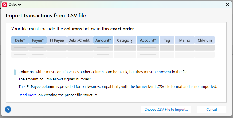 needs some updates. It has what I think are the Mint column names, does not include the Cknum column at the end, and says the Debit/Credit column must be populated.