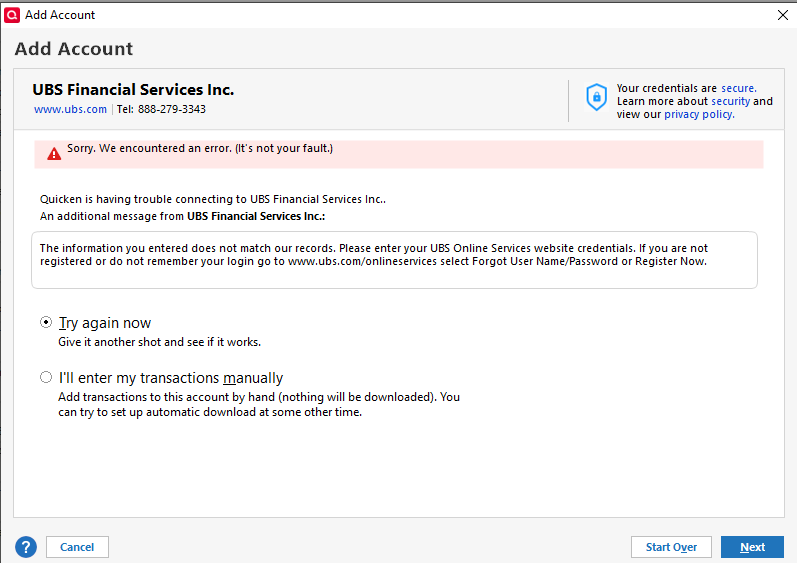 For the past several months, I've been trying to add a UBS Financial Services Investment account to my Quicken Classic account. In Quicken, I go through the steps to add a new account. When I get to the Quicken screen for entering the UBS Online Services User Name and Password I enter my UBS credentials. I know those credentials work as I can go directly to the UBS Online Services website and gain access. However, when I use those credentials through Quicken, I receive the attached error message stating the credentials don't match UBS' records. I recall seeing this same issue several months, but the issue was closed. Why, I don't know as the issue is still open. I've contacted UBS and they contend this is a Quicken issue. Any help to resolve this ongoing matter will be appreciated.