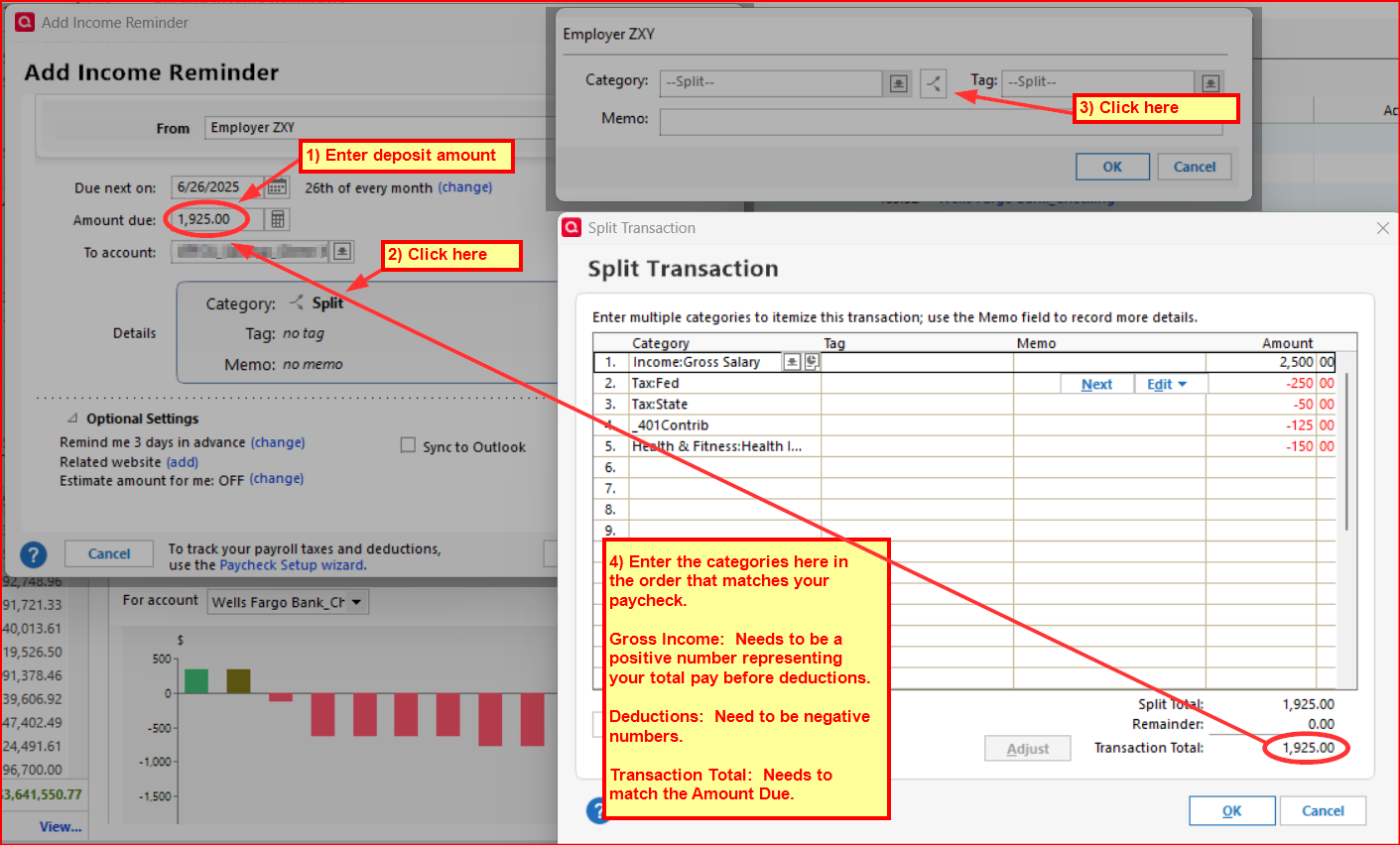 Then create a new Income Reminder. Now you will be able to set up the Reminder with all of the line items in the same order as on your paycheck as shown in the following picture. Just note that this will not let you track employer contribution lines.