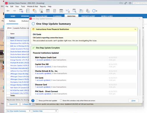 When I update my 3 data files daily, I get at least one with a Citibank connection issue. Today, in one data file I got both a Citibank and a Citi Card issue. The other 2 had just the Citibank. The accounts are always updated.
