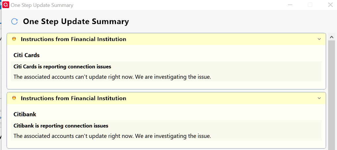 Today, One Step Update Summary had both a Citibank and a Citi Cards failure with connection issues. This occurred in two data files. The Last Downloaded column in my Accounts List says all accounts were updated today. I don't see any errors or missing data.