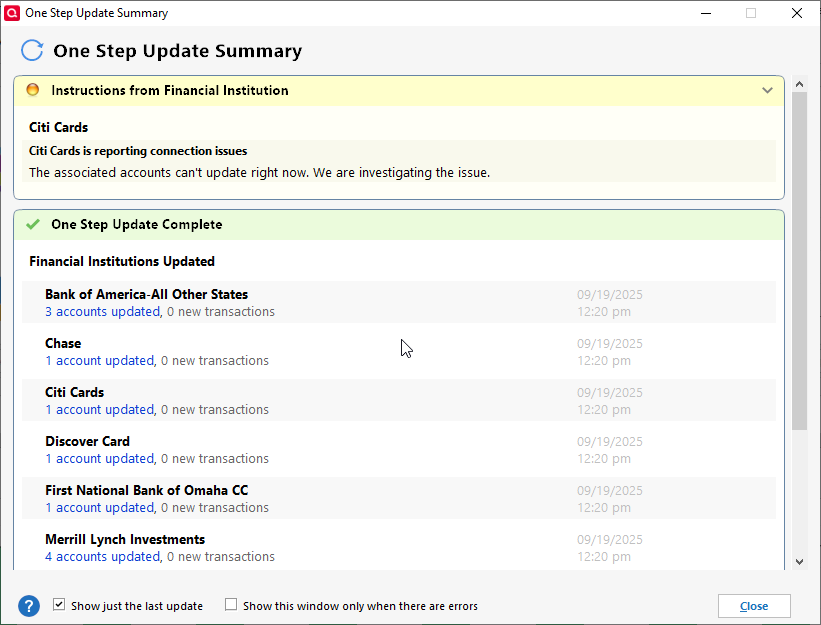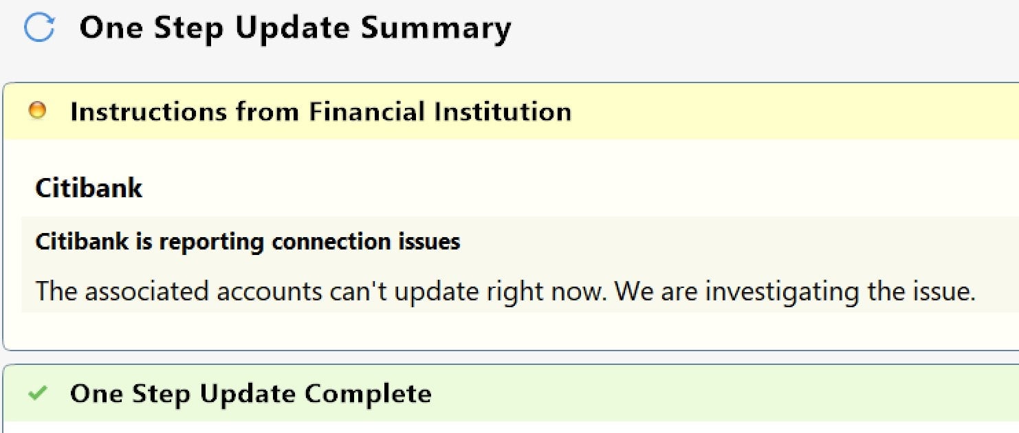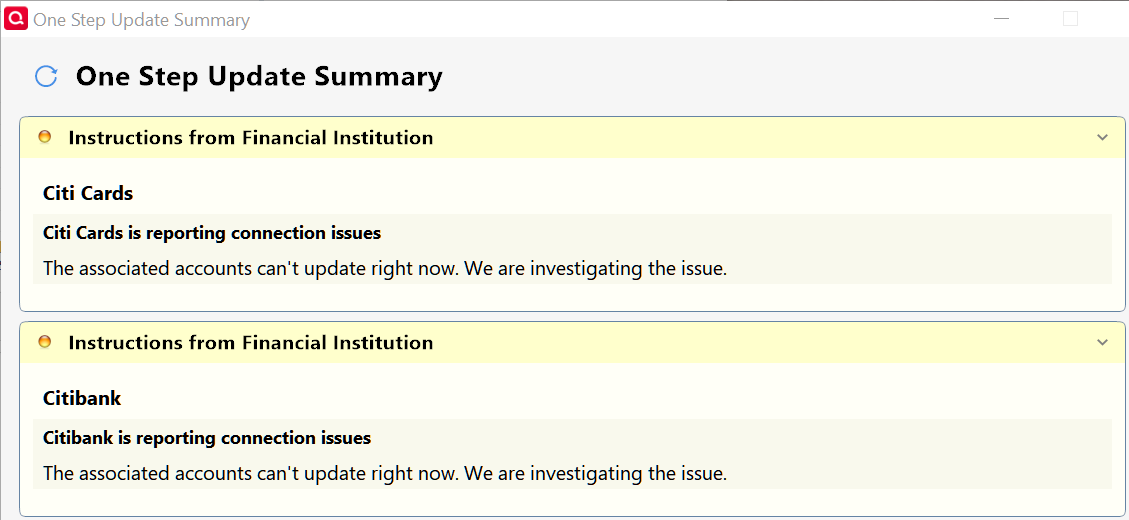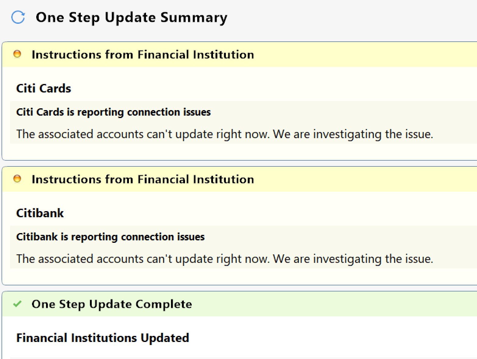 I update my 3 data files daily. It's a rare day when I don't get a Citibank or occasionally a Citi Cards connection error. The files always are updated so I just ignore it.