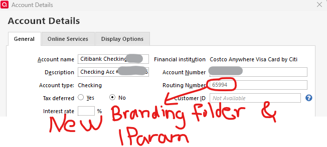 All bank transactions have been downloading fine and no more yellow warning message - so far. Naturally since the FI name is different, it created a new branding folder (65994) which corresponds to the lParam=65994 in the runtime.dat file - TMI perhaps.