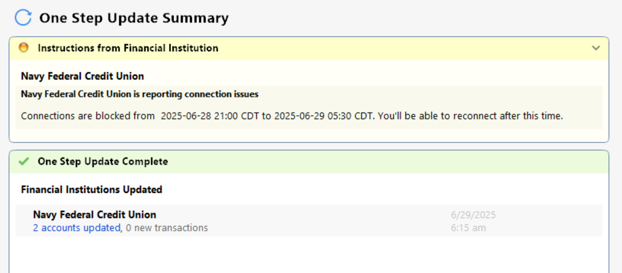 EDIT: I downloaded from another Quicken file with NFCU accounts in it and got the same message. So, it doesn't look like it's to do with hacking activity. It must be scheduled maintenance. Is this a Quicken message or a NFCU message?