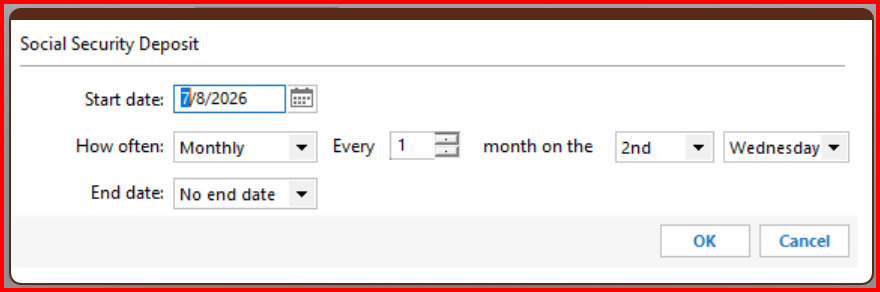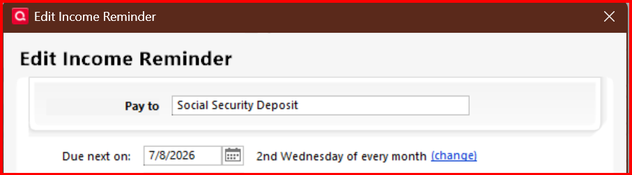 When setting up the reminder schedule the payments you need to use a special schedule set up for Social Security payments. In the main screen click on "Change" -