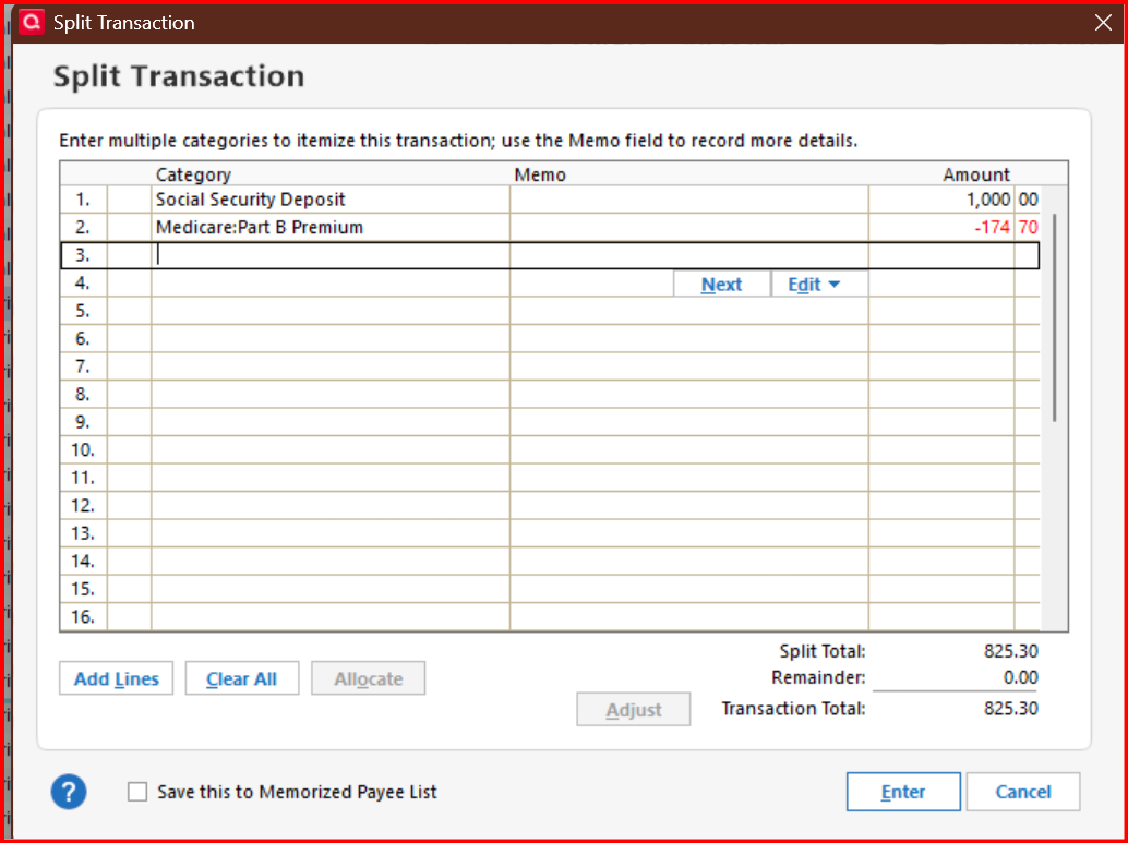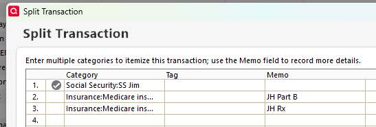 The first line is the gross SS payment, a positive number, and the other lines are the deductions, entered as negative numbers. The tax line item for the income is Form 1040:Social Security income, self.
