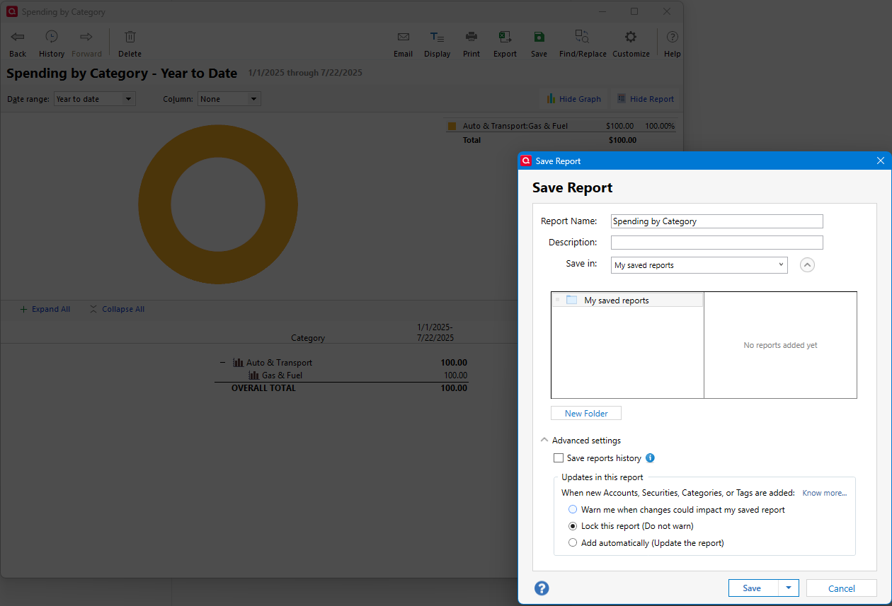 I have several saved reports. They are saved with "Lock this report (Do not warn)" enabled. Whenever I add new categories and accounts, all of the reports that use "Lock this report" are updated with the new category or account. It is behaving like "Add automatically (Update the report)" is set.