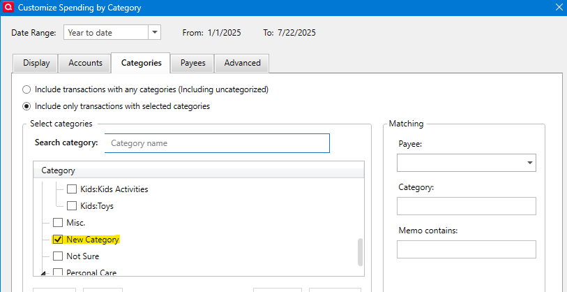 What you will notice is that the transaction with "New Category" isn't in the report. So, that part is correct.
