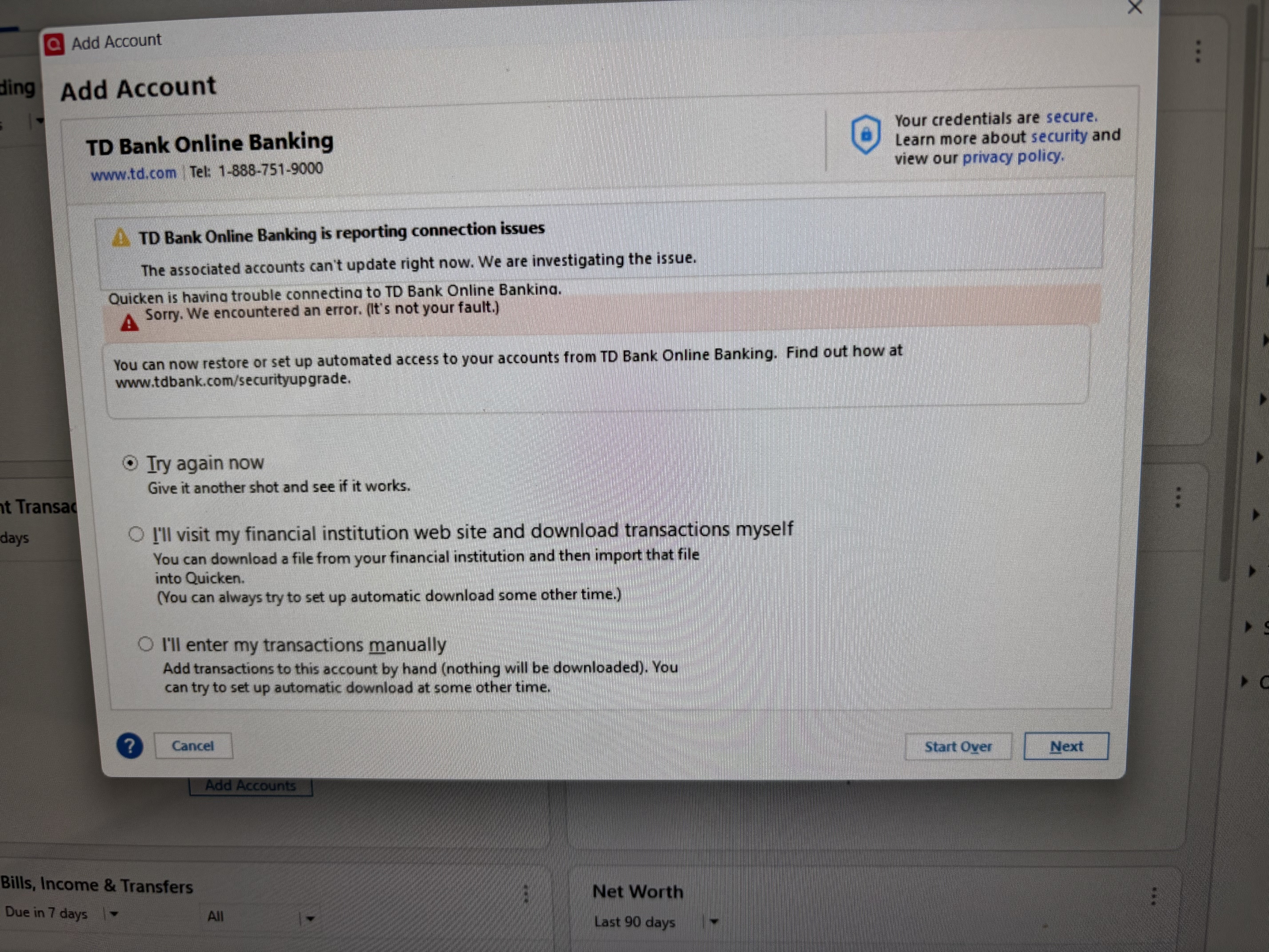 Currently unable to connect test acct to TD Bank. Tried multiple times. See attached photo of error message.