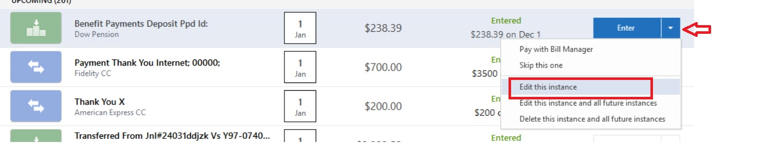 Go to Bills, Income and transfers tab, click on down arrow next to enter and click on edit this instance