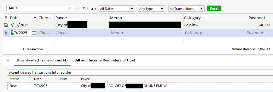 If, for example, you paid early on the City's website, it would have been better to immediately record the reminder with the actual payment date. This would have made it possible for Quicken to set Match status for the downloaded transaction upon arrival.