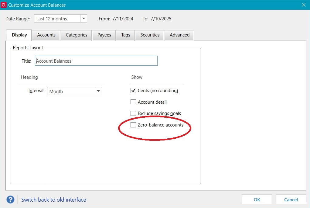 I tried it with my accounts, and it correctly eliminated one that had all zeros over the time interval. I have Windows Quicken Classic Deluxe (Windows 10).