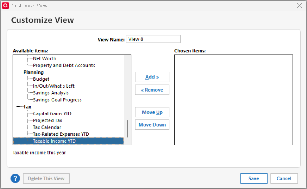 I did not see if you tried deleting and re-adding the Taxable income selection. I can add that selection to a new view without any such issue.