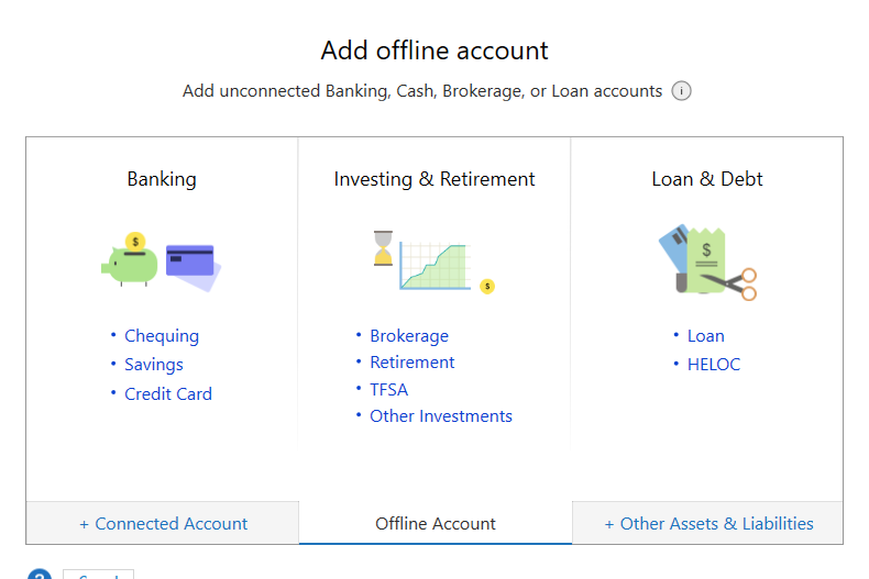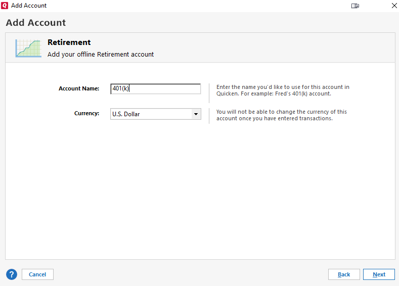I'm using Quicken Deluxe Canadian version, and am trying to add an offline retirement account: