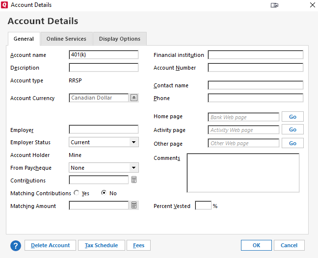 The 401(k) name is coming from Quicken. The Canadian version of Quicken uses the code for the 401(k) account in the US version and tries to bend it into being and RRSP for the Canadian version, but just best to avoid this entirely and just use the Brokerage account instead.