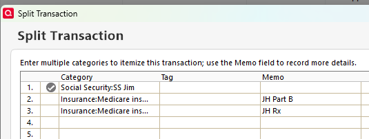 For the Social Security income, The Tax Planner uses the Tax line items that are assigned to the Categories you use for the SS income and withholding. Quicken does not include built-in Categories for SS income. You must create them and add the correct Tax line items. The split Deposit transaction should look something like this