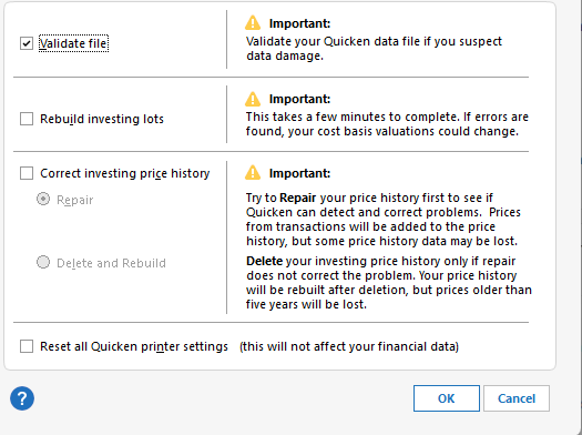 To continue troubleshooting file issues, the next step (per our help article on data file issues) is to export your Quicken data, create a new Quicken file, then import your data into that new file.
